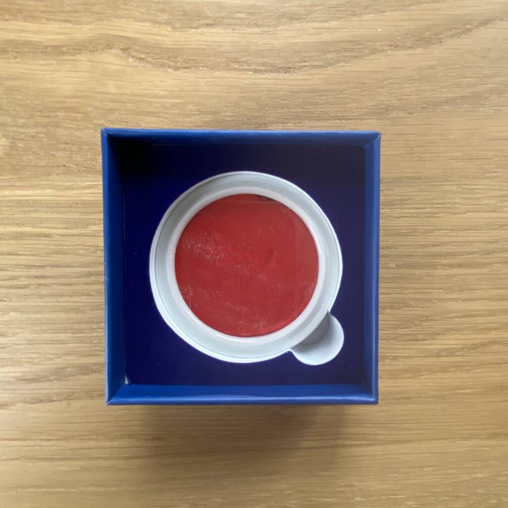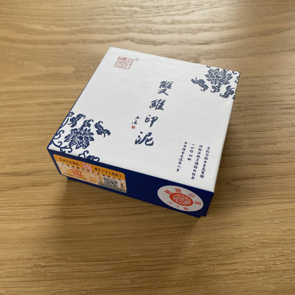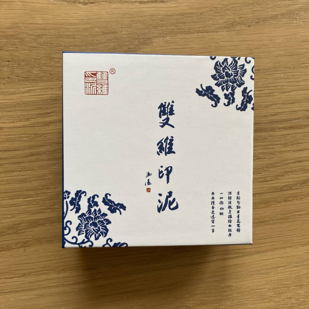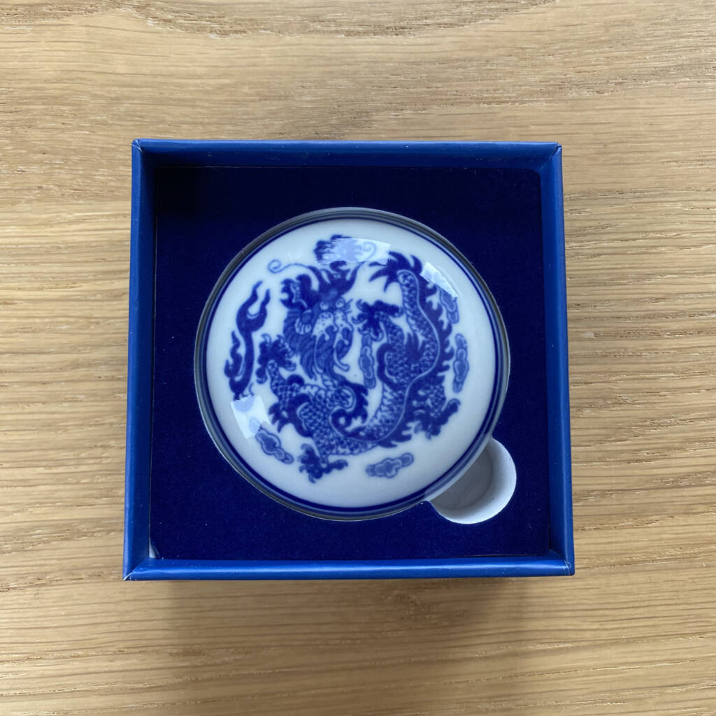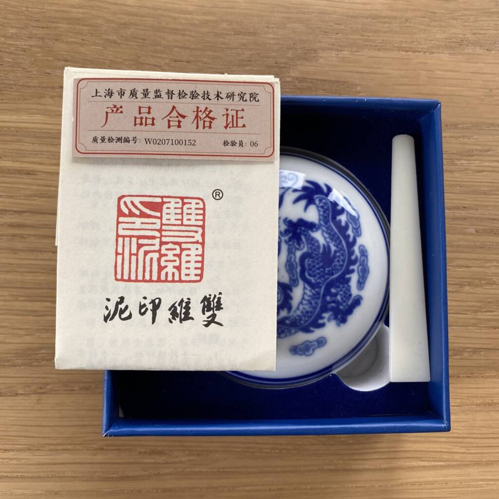Pasta rossa tradizionale per sigilli, custodita in un elegante contenitore in porcellana decorato con motivo a drago blu. Utilizzata nella calligrafia e nella pittura sumi-e, questa pasta consente di imprimere il sigillo con un segno pieno, vivo e leggermente materico, che diventa parte integrante della composizione.