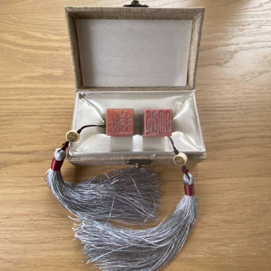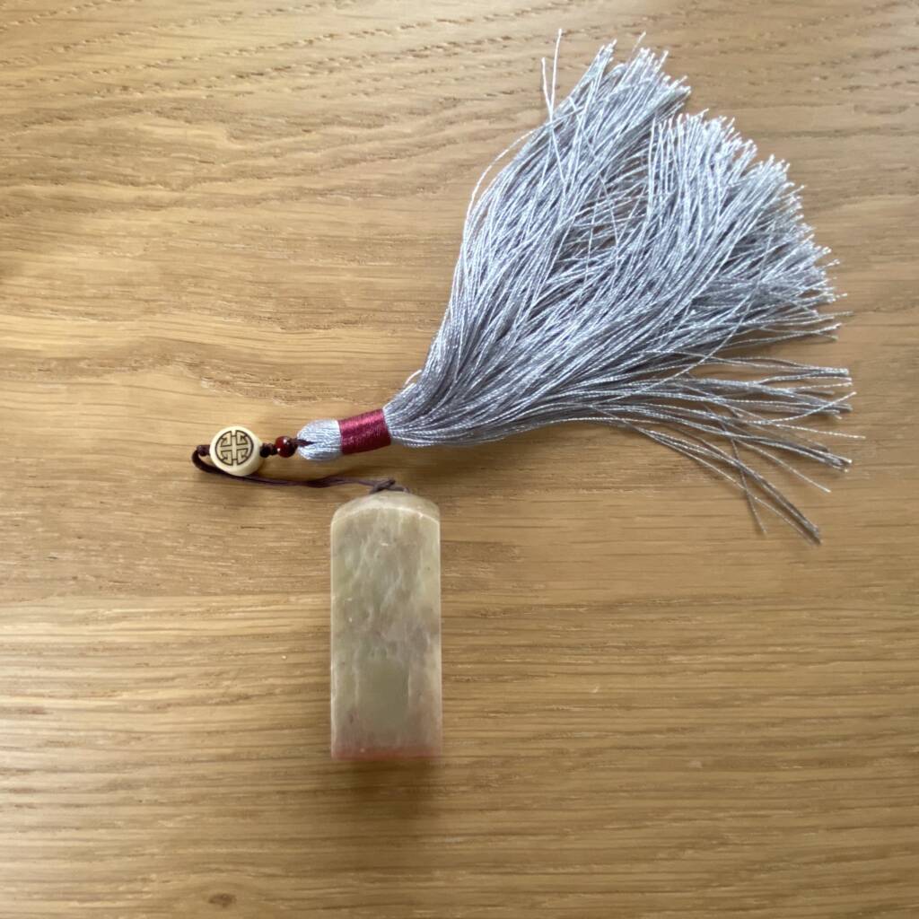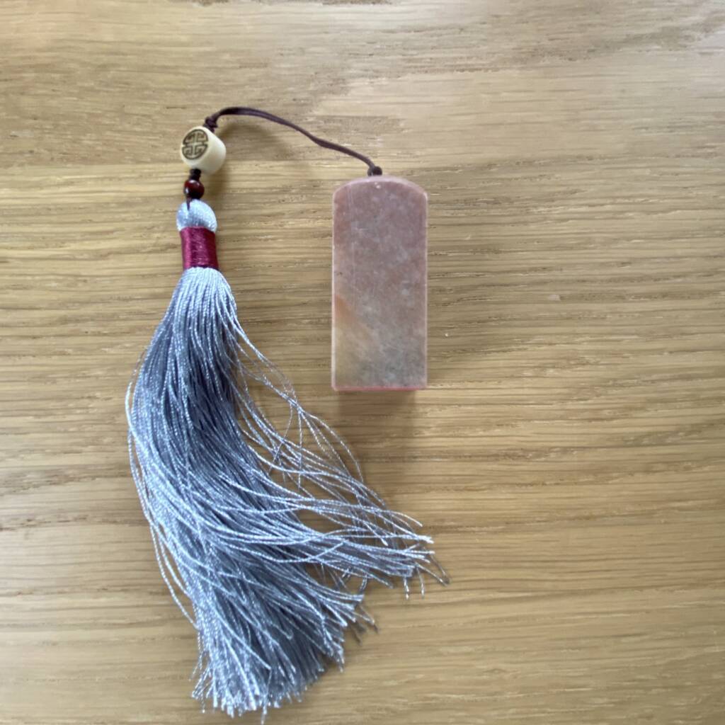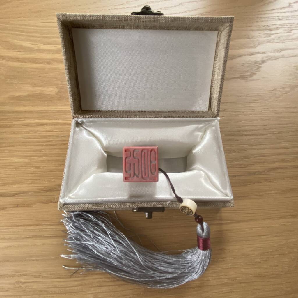Sigillo in pietra inciso con caratteri zen. Ogni sigillo presenta un’incisione differente ed è corredato da nappina decorativa e scatola di protezione.